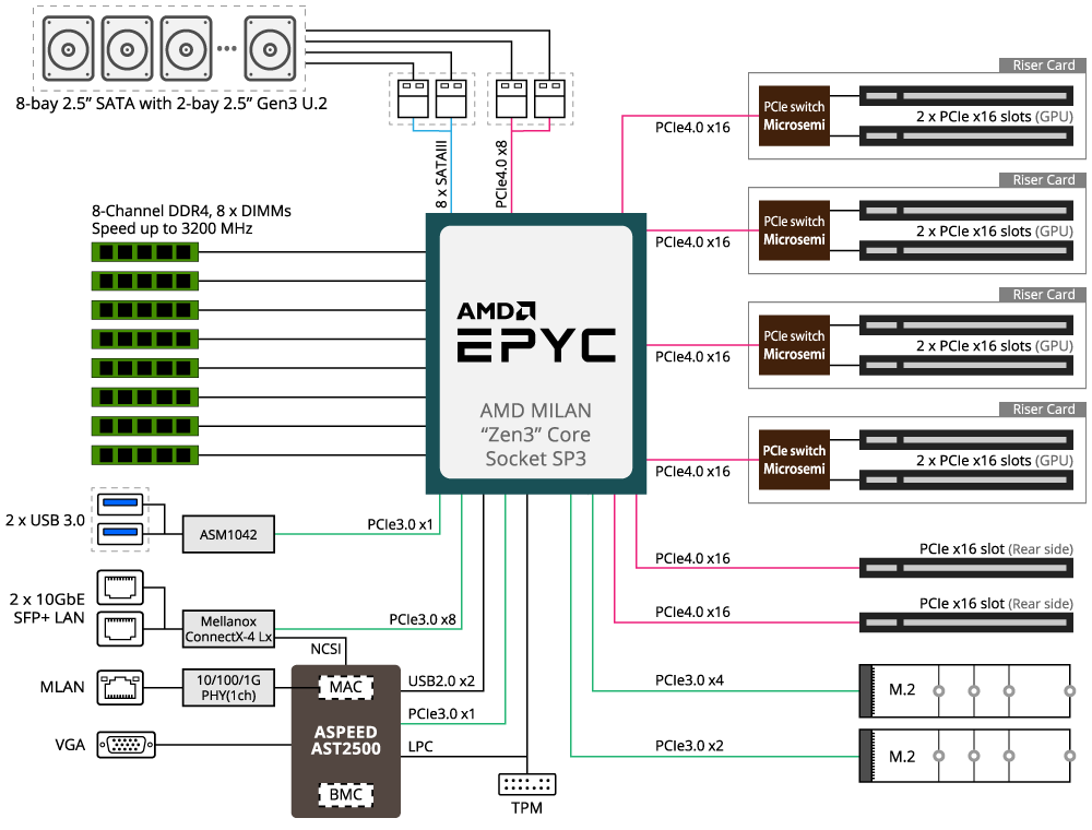 HPC Server - 2U UP 8 x Gen4 GPU Server ( Microchip Lösung) für AI , AI Training , AI Inference & HPC